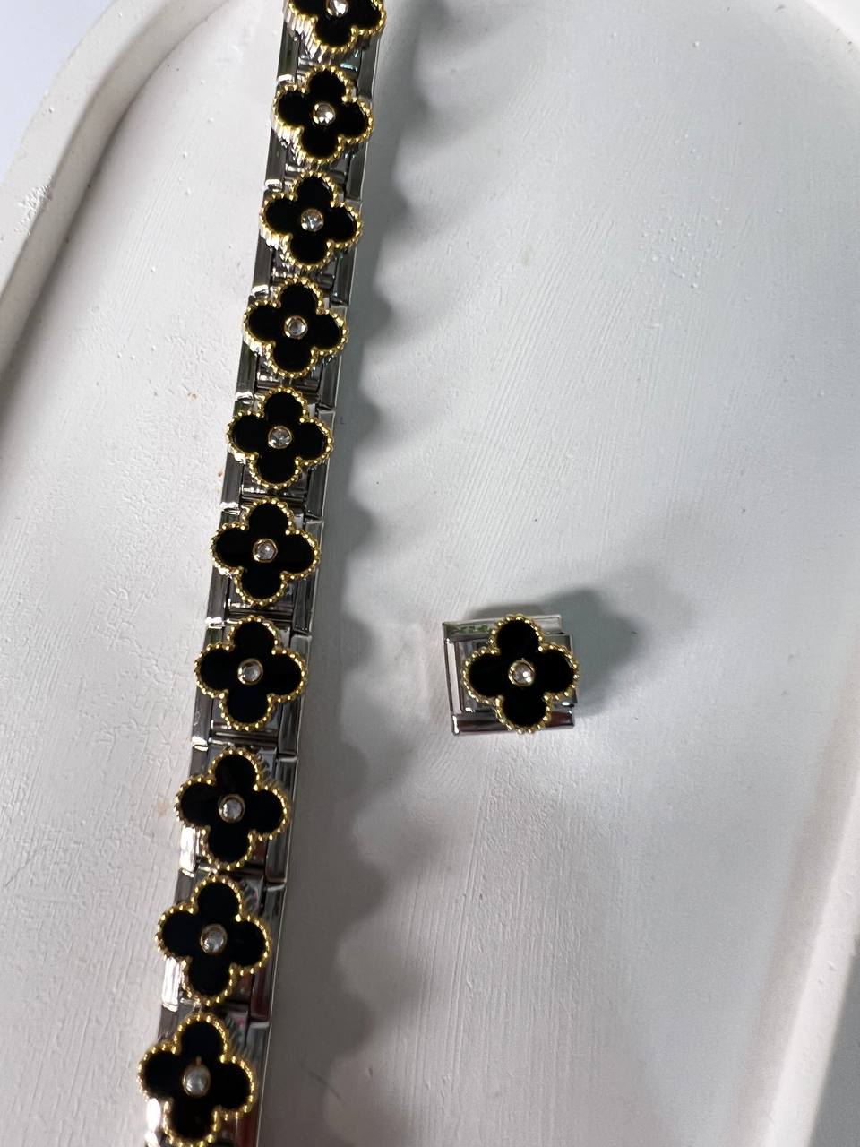Découvrez notre nomination Van Cleef noir en acier inoxydable, alliant élégance et raffinement intemporel. Son design inspiré du célèbre trèfle porte-bonheur, rehaussé d’une finition noire profonde, en fait un bijou chic et sophistiqué. Parfait pour sublimer votre style avec une touche de luxe et de modernité.